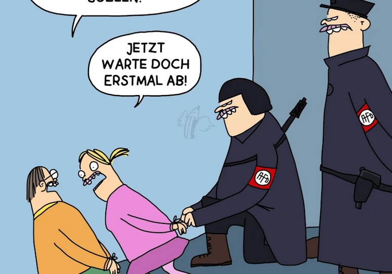 Der deutsche Karikakturenpreis macht dieses Jahr auf Gesundheitsfetisch. Zwei AfD-Polizisten mit schlechten Zähnen wollen zwei Bürger mit noch schlechteren Zähnen zur Zwangszahnbehandlung schaffen. Ein Mix aus Orwell, Kynast und von Rotz.