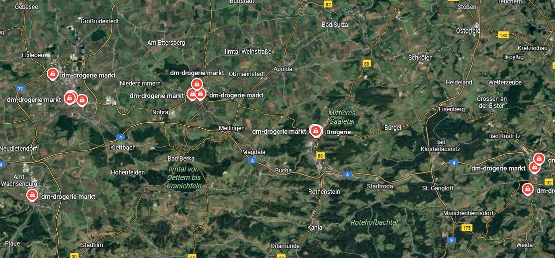 Man geht ins Google Maps und gibt „dm Drogeriemarkt“ ein. Dann bekommt man die Standorte und kann sich einen hochzoomen.